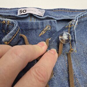 Details: Brand is SO (Goods for Life) as shown on the tag. Style is Flare jeans with a high rise, lace-up suede cord detail at the front, and frayed unfinished hem to the legs for a retro Y2K-inspired look. Classic back pockets. Blue wash denim with seamed panel front and back for a vintage nod.