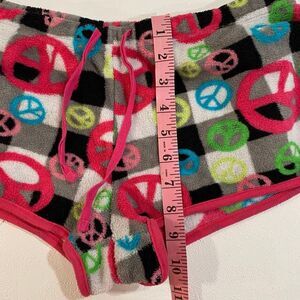 Cozy and fun SO® fleece lounge shorts in a colorful peace-sign checker pattern, size L. Made from soft, plush 100% polyester with a comfy elastic waistband and pink trim. Perfect for lounging, sleepwear, or casual days at home. Add a nostalgic Y2K touch to your comfy closet!
