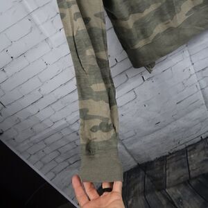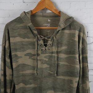 GREEN CAMO LOUNGE LIFE HOODED LONG SLEEVE LIGHTWEIGHT T SHIRT WITH TIE DETAIL SIZE SMALL BY SO PRE OWNED NO FLAWS