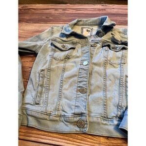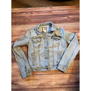 SO Girls XS denim jacket (fits 10/12) in a light wash blue with subtle distressing for that Y2K-inspired look. Features button front closure, front chest pockets, and classic jean jacket seams. Barely worn — like new condition with no rips, holes, or stains.
