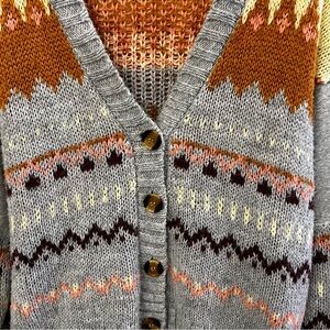 Stylish gray knit sweater. Features vibrant color accents. Ideal for casual wear. This long sleeve item has a button front. This sweater is made out of 100% acrylic. The size is large. The measurements are 23” L x 22” W (pit to pit) x 29” sleeve (collar to cuff). This great cardigan has been gently worn but is in excellent condition.