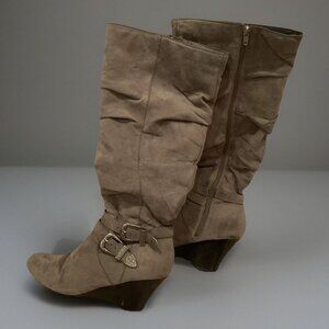 These women's knee-high boots from SO are a great addition to any wardrobe. The boots feature a sleek gray suede upper material and a comfortable size 9 fit. The knee-high style is perfect for colder weather and the boots are versatile enough to be worn with a variety of outfits. Whether you're dressing up or down, these boots are sure to become a staple in your wardrobe.
