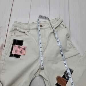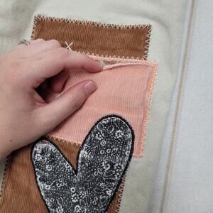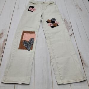 Super cute SO Goods for life "Wide leg" jeans! High rise in a cream color with allover patchwork and heart detailing. In sturdy condition, has slight wash wear and a small tear in one patch (Multi layered so there's no hole). Size 3/26