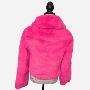 SO hot pink faux fur jacket size XS. 18" from armpit to armpit. 11" from armpit to bottom hem. Absolutely gorgeous. Looks as if it has never been worn. No flaws of any kind. Fur is still fuzzy and perfect and does not appear to have ever been washed. Four snaps to close the jacket. All snaps are tight and intact and functional.