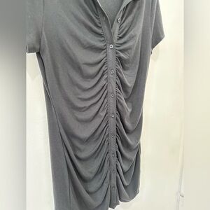 Chic black button down dress by SO. Features elegant ruched front. Perfect for versatile styling.
