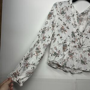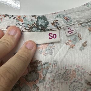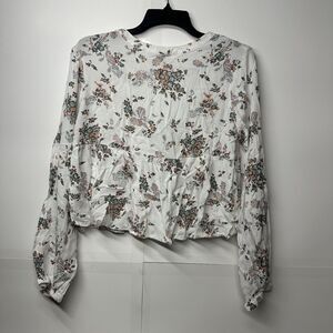 SO Juniors Small Boho Floral Peasant Top Long Sleeve Lace Up Blouse White