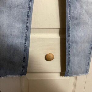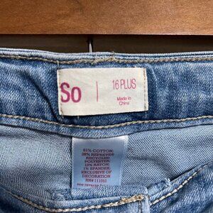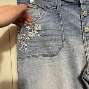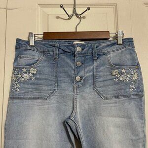 SO Juniors Women's Light Wash Floral Embroidered Raw Hem Snap Button Fly Skinny Jeans Size 16 Plus. Measurements Waist: 32" Inseam: 28" Rise: 10" Offers always welcome! Measurements are approximations taken while hanging