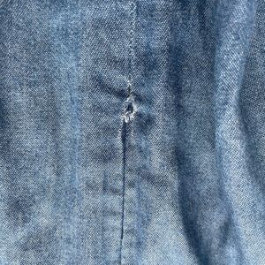 Chic light blue denim dress with adjustable straps and button details. Some damage at the end of the zipper where it meets the fabric. Otherwise in good condition no stains