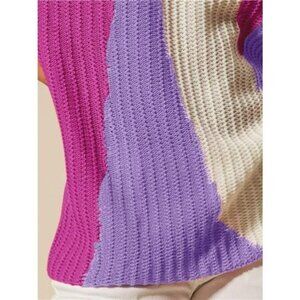 *This stylish colorblock pullover sweater features a vibrant striped design with purple, pink, and cream vertical panels. Crafted from soft ribbed knit fabric that offers excellent stretch and comfort. The short sleeve design makes it perfect for transitional weather and easy layering. The round neckline and relaxed fit provide all-day comfort while maintaining a fashionable silhouette. Made from quality knit material with ribbed texture that adds visual interest and ensures durability. Perfect for casual outings, weekend wear, or adding a pop of color to your wardrobe.