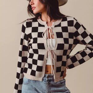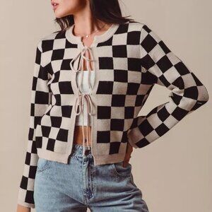 SO ME Tie Front Checkered Knitted Round Neck Cardigan