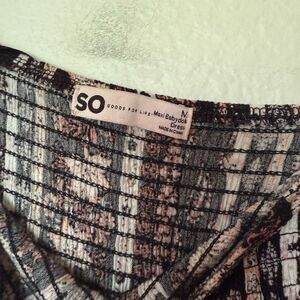 This stylish sundress by SO features a ruffled, tiered design in a classic black and white color scheme. With its sleeveless spaghetti straps and lightweight fabric, it's perfect for casual outings or resort wear. The dress's flowy silhouette and intricate pattern make it a chic choice for warm weather.