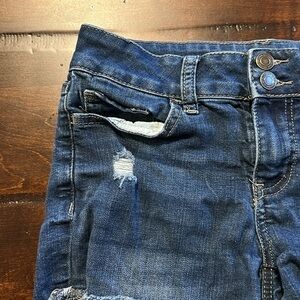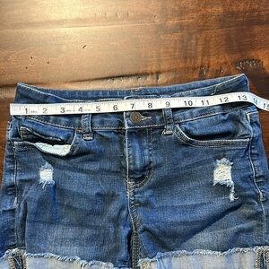SO juniors medium wash denim shorts in size 3, featuring a rolled hem for a stylish finish. These shorts offer a comfortable stretch and a trendy design with double button closure.