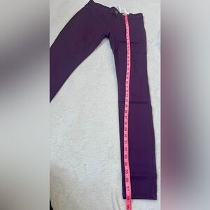 SO branded jeggings in a deep plum/purple color, decorative(non-functional) front button and pockets, back pockets, pull-on super stretch fabric, low rise, 30.5 inseam.