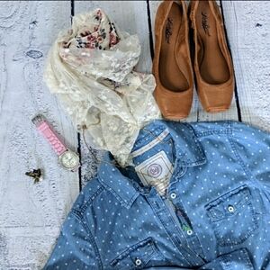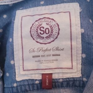 SO Perfect Shirt Button Chambrey Swiss Dots Juniors / Jr XL Blue White Spring