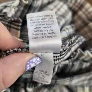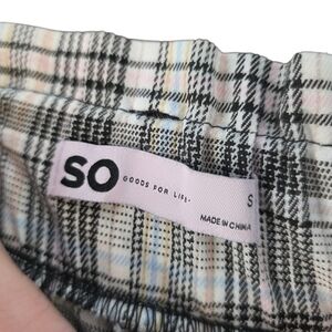 These adorable SO by Kohl's paperbag waist pants are a cozy must-have! Featuring a soft plaid pattern in subtle pastels (pale pink, blue, and yellow) over a black-and-white base, these pants add a playful yet polished touch to your wardrobe. The paperbag waistband with removable belt flatters the waist, while the tapered leg creates a modern silhouette.