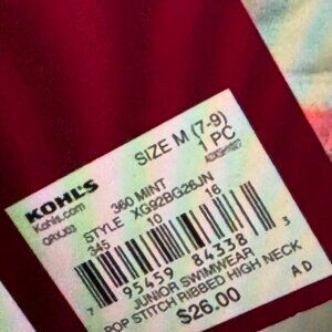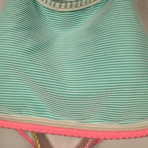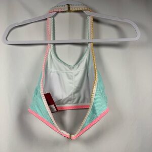This SO Pop Stitch Ribbed High Neck Bikini Top is brand new and has the original tags attached. The color is called mint and has white and coral pinkish color trim. It is a juniors size medium (7-9). See pictures - super cute!