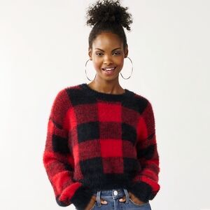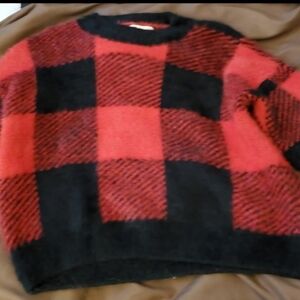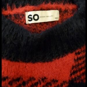 Soft and warm fuzzy sweater. Features a striking red and black pattern. Size xl in juniors, SO brand, and never worn.