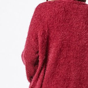 BERRY COLORED FUZZY CARDIGAN WITH POCKETS AND BELT 54% ACRYLIC 46% NYLON OPEN FRONT, TRUE TO SIZE