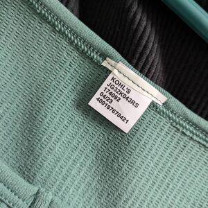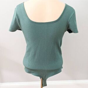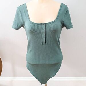 SO Seamless Henley Bodysuit. Green bodysuit top with snaps at crotch and 4 button Henley styling. Short sleeves and square neck. Thong styling.