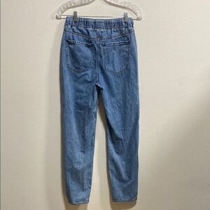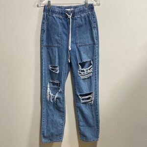 so distressed jeans, high rise denim jogger, ripped jeans 26 waist, juniors denim jogger, y2k aesthetic, elastic waist jeans, soft denim pants, size 3 jeans