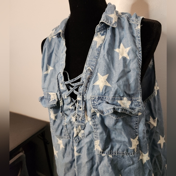 •SO Size XL Sleeveless Star Patterned Denim Dress Y2K Criss Cross Laces In Front. Stylish denim dress with white star patterns. Features a lace-up front for a trendy look. Has two front pockets. Criss cross laces down the chest too make a v-neck. In good pre-owned condition. Bundle for a better price!