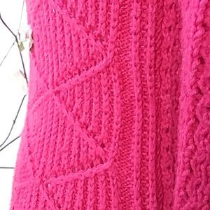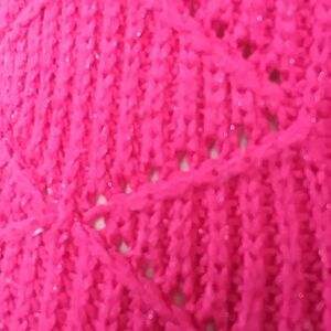 Flattering fitted soft and stretchy hot pink scoop neck pull-over sweater with criss-cross diamond pattern down the front. The sweater has sparkly metallic hot pink thread woven throughout. It is really soft and comfortable. Great for work, errands, lounging and many other occasions. Dress it up or down. In excellent pre-owned condition with no flaws.