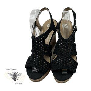 SO Taffy Wedge Heel Sandals Women's Woven Peep Toe With Cork Heel Size 8.5 Black