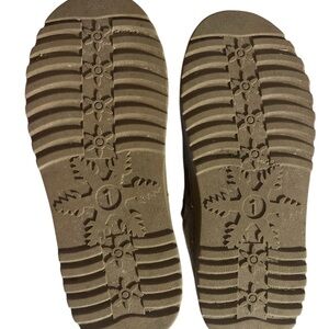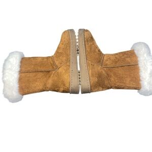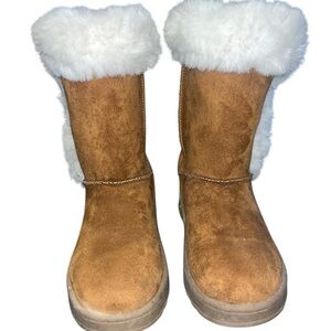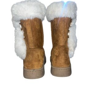 Stylish tan boots with cozy white fur trim. Perfect for cold weather.