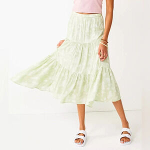 Explore the effortless charm of the SO Tiered Midi Skirt, a perfect blend of casual elegance and playful flair. Flaunting a vibrant green and white floral pattern, this peasant-style skirt caters to a variety of occasions, from a relaxed day at the beach to a chic cocktail party. The lightweight knit fabric, crafted from soft rayon, ensures comfort and ease of movement, making it a delightful choice for any season.