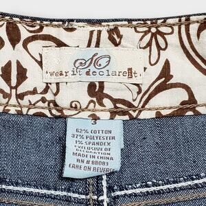 SO Wear It Declare It dark blue wash denim micro mini skirt with brown and white stitching details.
