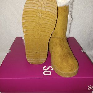 Size 6 - Women's SO. ABIGAIL BOOTS has side buttons and faux fur lining in the color Chestnut Tan & White