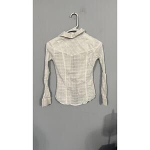 SO White Fitted Button Down Shirt 100% Cotton in Juniors Size Small. Long, roll tab Sleeves, crosshatched pattern, double front pockets, collared. Shirt is in good used condition with no flaws or stains other than some minor wash wear. Business casual, office, career wear, dress clothes, dressy top.