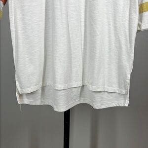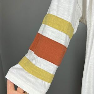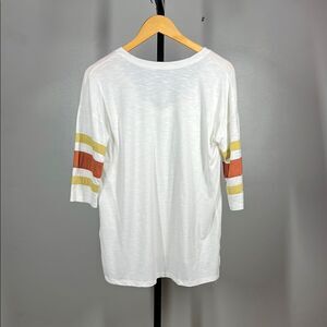 Casual white V-neck tee. Features colorful striped sleeves. Perfect for everyday wear.
