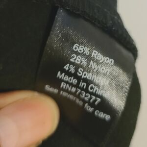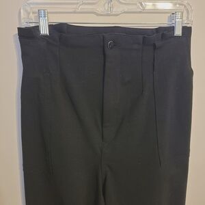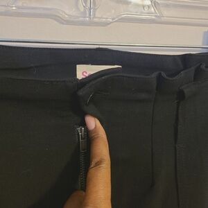 Women's black, high waist stretch pants by SO, size 20. Pants are pullon style, zipper and button closure. Pants come with a matching black fabric belt and slightly rolled bottom hems. Fabric: rayon, nylon and spandex. Excellent pre-owned condition; no flaws.