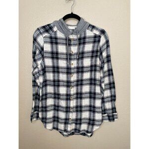 SO Womens Black Plaid Button-Up Hoodie Shirt Small 100% cotton long sleeve