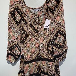 SO Women's Brown Multi Lace Inset Tiered Long Sleev Babydoll Dress Medium NWT