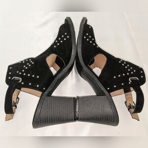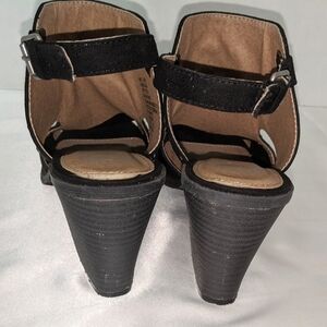 This is a pair of SO Women's Catfish Sandals with 3.25" Block Heels and Ankle Strap. They are black with gunmetal studs. Size 8M. Open Toe. A small amount of edge wear to the block heels. Otherwise in very good pre-owned condition. Please see pics for details.