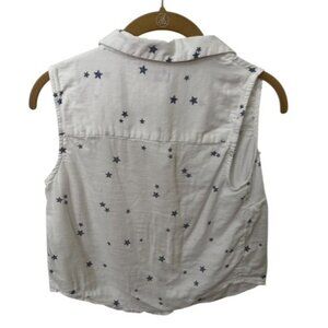 The product is a women's small button-down crop blouse by the brand SO. The blouse features a collared neckline and sleeveless design, made from cotton fabric with a white color and gray star pattern. The cropped style adds a trendy and fashionable touch to the top, making it a versatile and stylish addition to any woman's wardrobe.