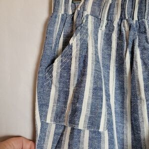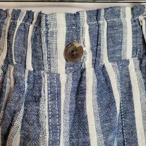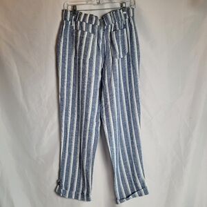 SO Tapered Leg Linen Blend Mid Rise Pull On Pants. Women's size large. Blue and white striped. Has an elastic waist with belt loops. Front and back pockets and a roll tab hem. Measurements are approximate waist laying flat 15" rise 10" inseam 29". In great preowned condition.