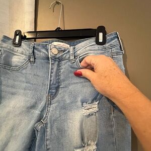 SO Women's Ultimate Jegging Low Rise Distressed Denim Blue Jeans, Size 7/28