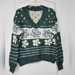 SO Womens V-Neck Pullover Sweater Oversized Chunky Knit Green Daisy XS