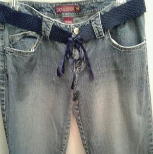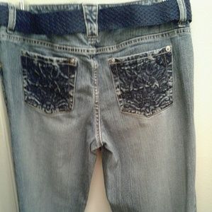 Denim jeans, flared leg with a few loose strings at the bottom. Blue flower lace material on back pockets with matching belt. Beautiful jeans in great condition!