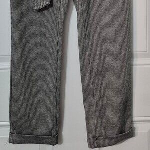 Black/white tiny hounds tooth design. Belt surrounds a "ruffle" top with belt loops. Legs are cuffed. They are size 9 by SO. Good looking pants for work or play.Unique design , patch front pockets, removable belt/tie.
