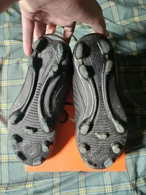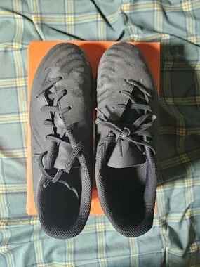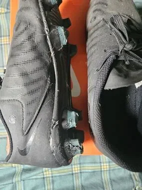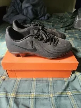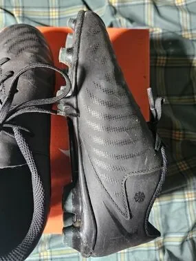 Sleek low-profile soccer cleats from Nike. Lace-up front for a secure fit. Molded studs for traction on grass. Lightweight synthetic upper for mobility. Subtle Nike Swoosh branding on the side. Multi-ground. Our dog chewed on the bottom heel of the one cleat as shown in the 3rd picture. But other than that they are hardly worn and good condition. Comes with original box.