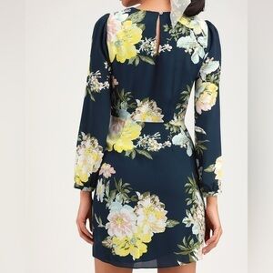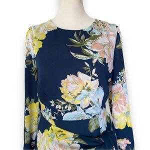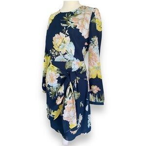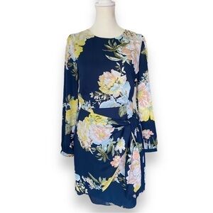 Socialite Rice Navy Blue Floral Print Tie-Front Long Sleeve Dress Size Extra Small. The Socialite Rice Navy Blue Floral Print Tie-Front Long Sleeve Dress is upping the ante at cocktail hour! Lightweight woven fabric in an elegant navy blue, yellow, green, light blue, and white floral print, falls from a rounded neckline into sheer long sleeves with button cuffs. Relaxed, darted bodice and fitted waist sit above a sheath mini skirt with a cool overlapping layer that ties at the side. Back keyhole with top button and hidden side zipper.