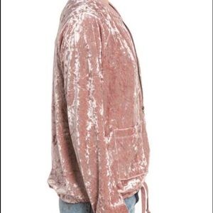 Tackle two trends with one jacket: This lightweight bomber is done in lustrous pink crushed velvet for a bit of luxe texture.
