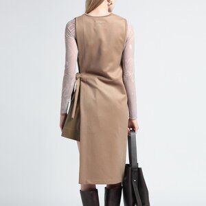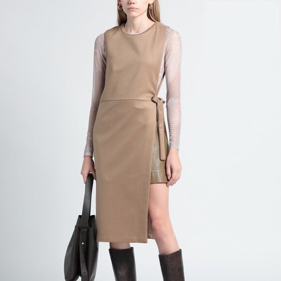 Elevated minimalism with a modern architectural edge. This Société Anonyme Chagal midi dress is crafted in Italy from luxurious wool, featuring a clean sleeveless silhouette with an elegant side slit and wrap-style tie detail that adds subtle movement and shape. The neutral camel/taupe tone makes it endlessly versatile—timeless, polished, and quietly powerful.