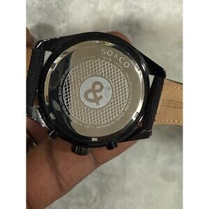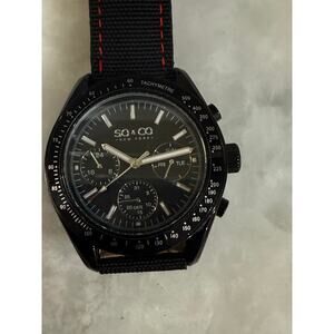 SO&CO New York men’s multifunction quartz watch in stealthy black with a canvas/NATO strap (red stitching). Clean dial with three subdials: 24-hour, day of week, and pointer date. Fixed tachymeter bezel. Caseback notes hardened mineral crystal, 100 meters water resistance, stainless steel, and Japan movement.