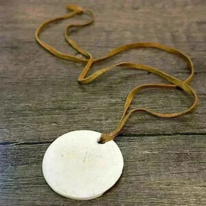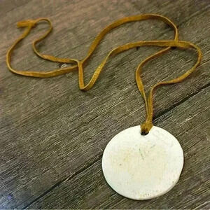 Pendant measures approximately 1 1/2” in diameter. Necklace measures 12 1/2” long from mid necklace to end of pendant. Leather necklace strand ties.