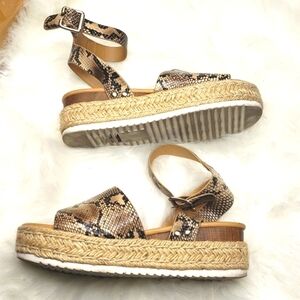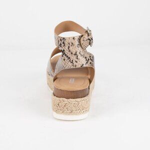 Soda Topic espadrille flatform sandals. These sandals feature a natural python leather upper with strap across foot and around ankle. Ankle strap with metal roller buckle is adjustable for a secure fit. Footbed is synthetic and the midsole is mixed espadrille cord and synthetic platform. Rubber outsole. Approx. heel height: 2.25"